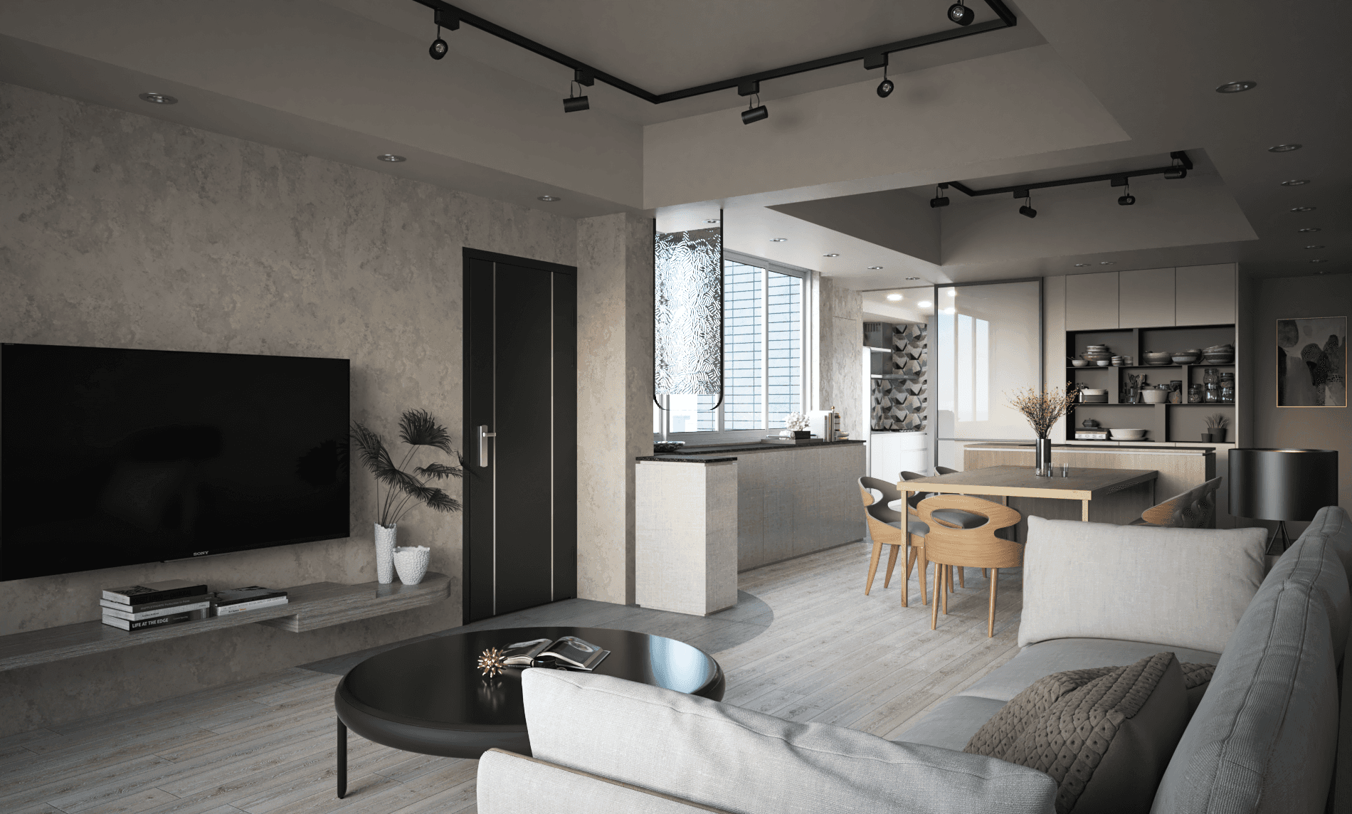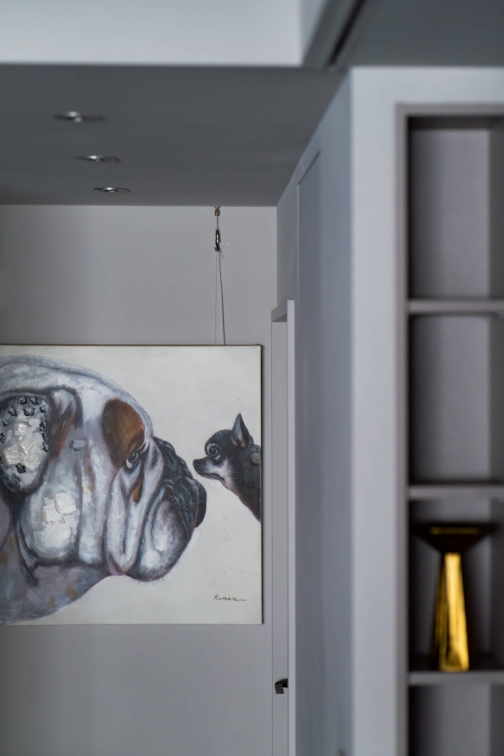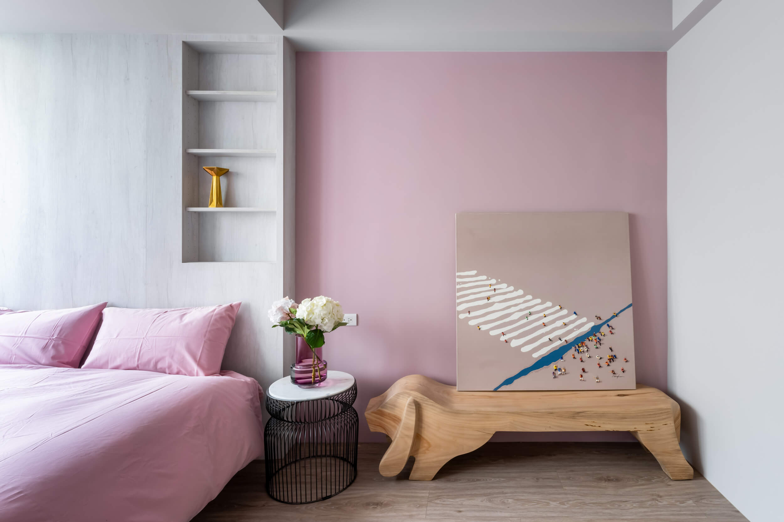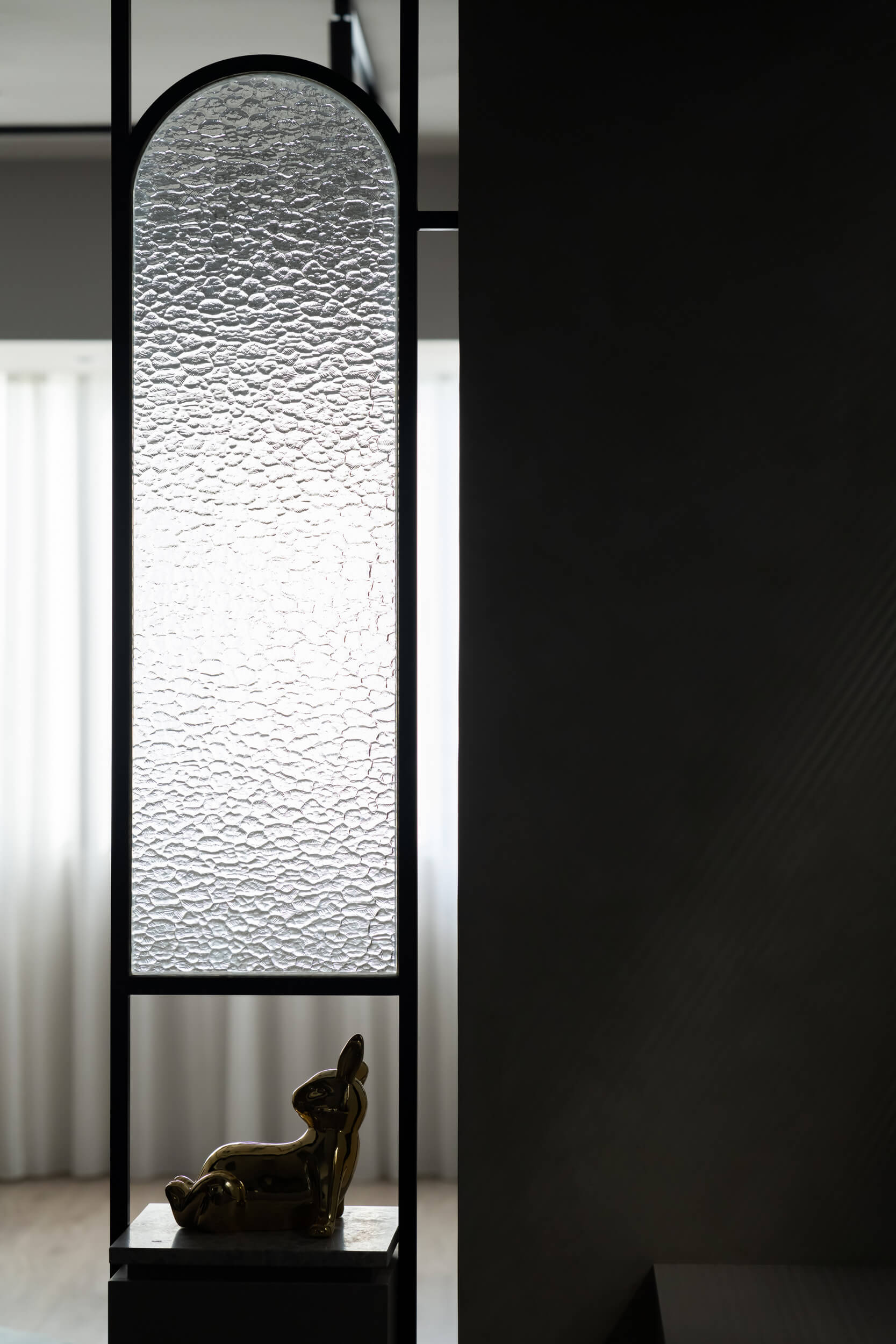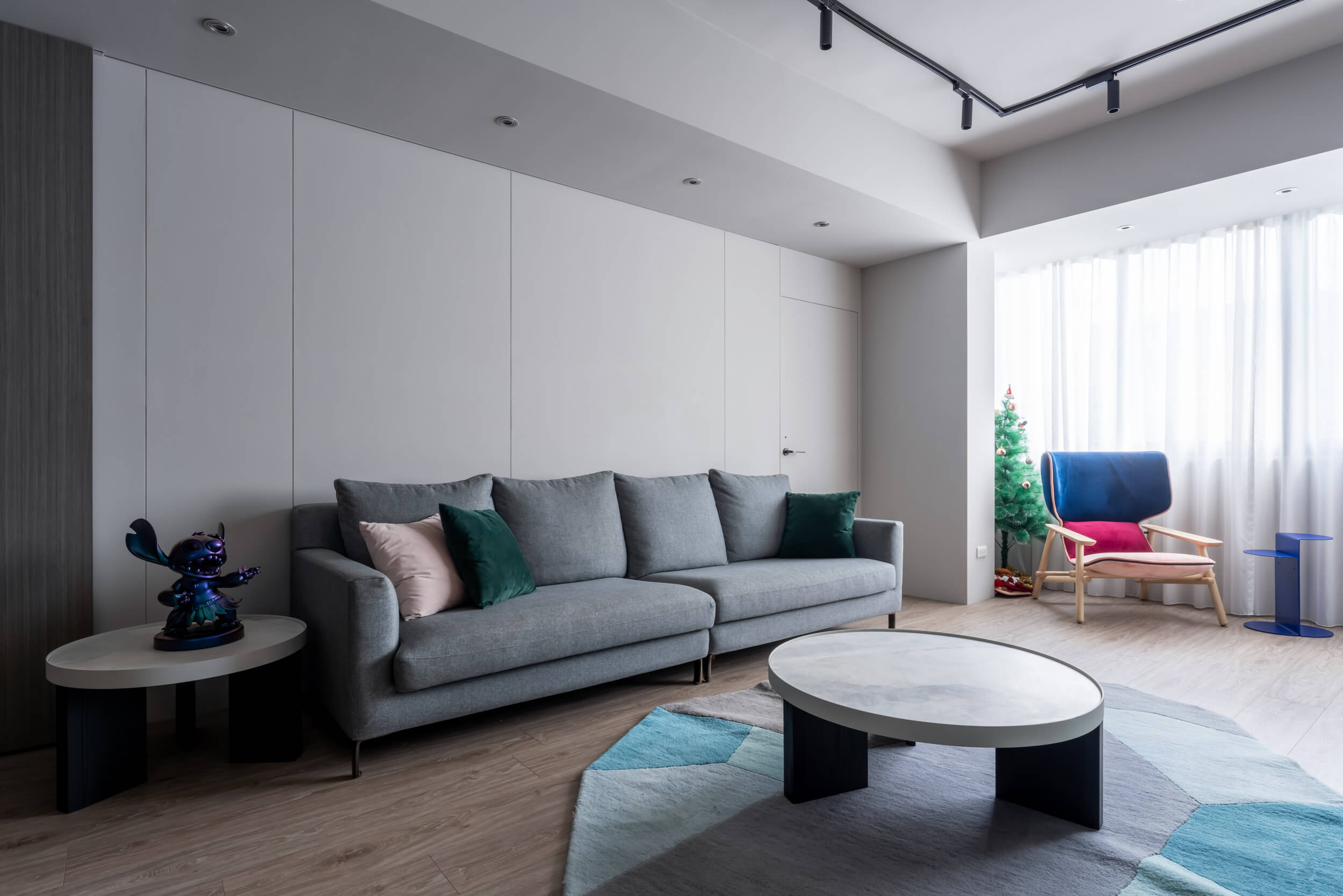 整體使用溫潤暖灰色壁面、純手工斑駁特殊漆加上櫃體與深色木地板創造層次美,透過陽台及窗邊的陽光讓空間變得柔和自然;再使用特別又復古花磚點綴氛圍,宛如春天拂過大地般的清爽明亮。