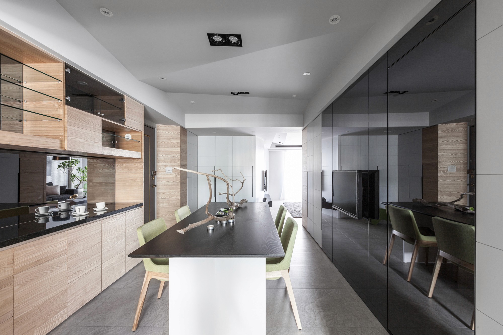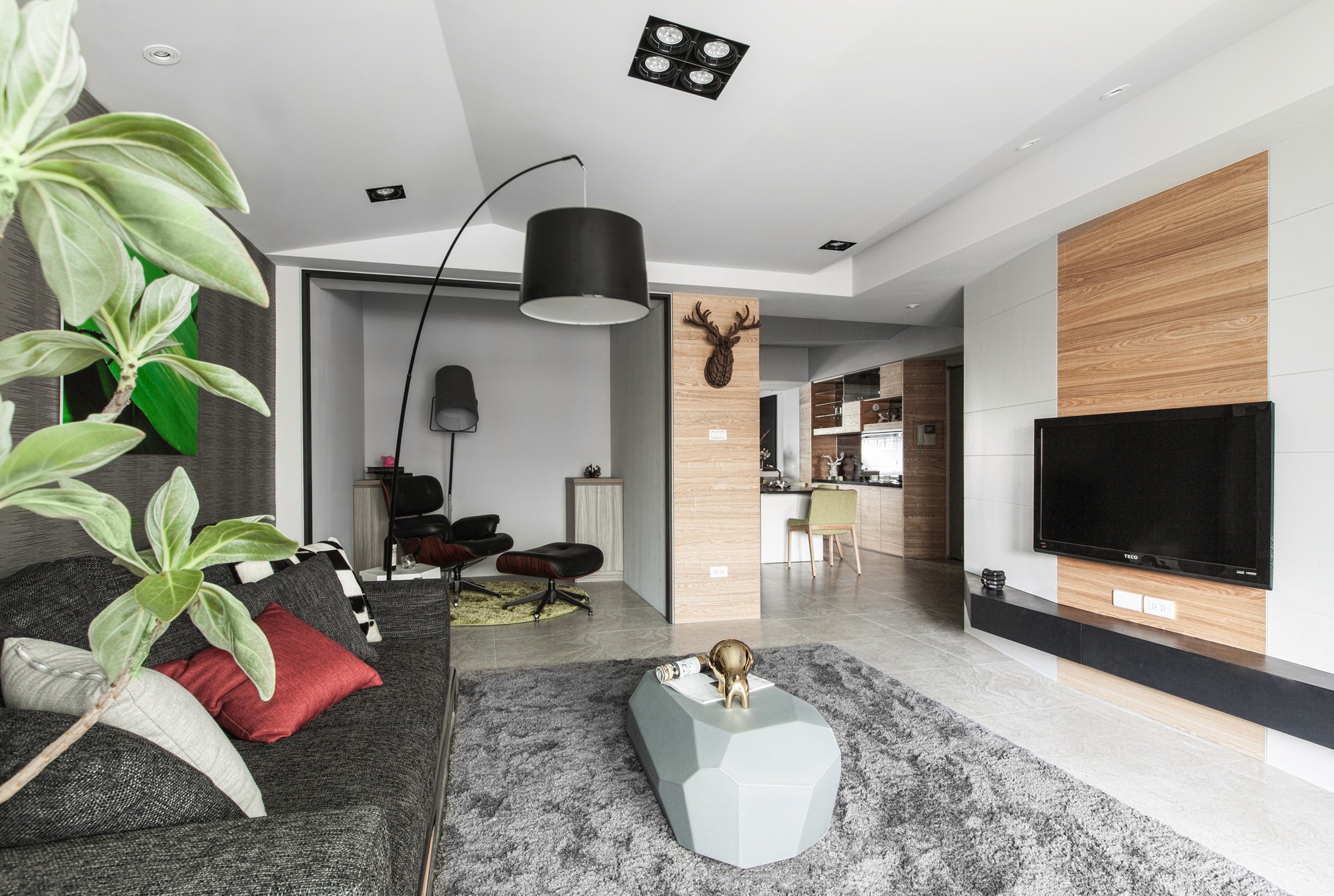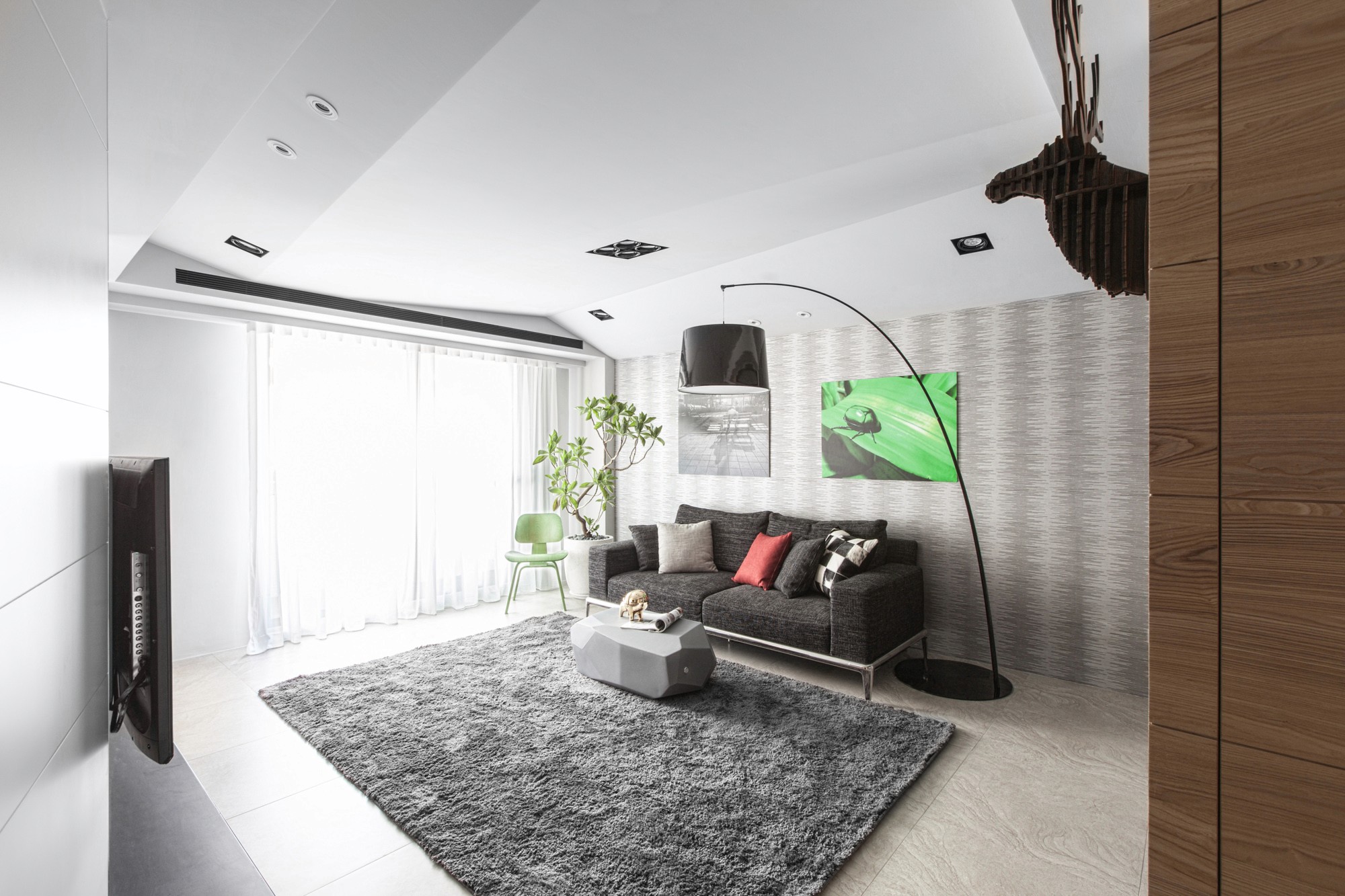 在了解屋主因為兒女各自開枝散葉必須整理房子,家庭擁有如同大樹葉脈般成長、延伸、壯大的傳承寓意,在空間上不全然使用垂直水平配置,改用如葉脈般的斜線界定;在天花與壁面造型上亦呼應相同斜線邏輯並適時的加入天然木紋紋理;在顏色運用上使用大量令人放鬆的淺灰色並在家具上點綴些許綠色,客廳落地窗邊放置落地植栽,營造退休放鬆的氛圍。