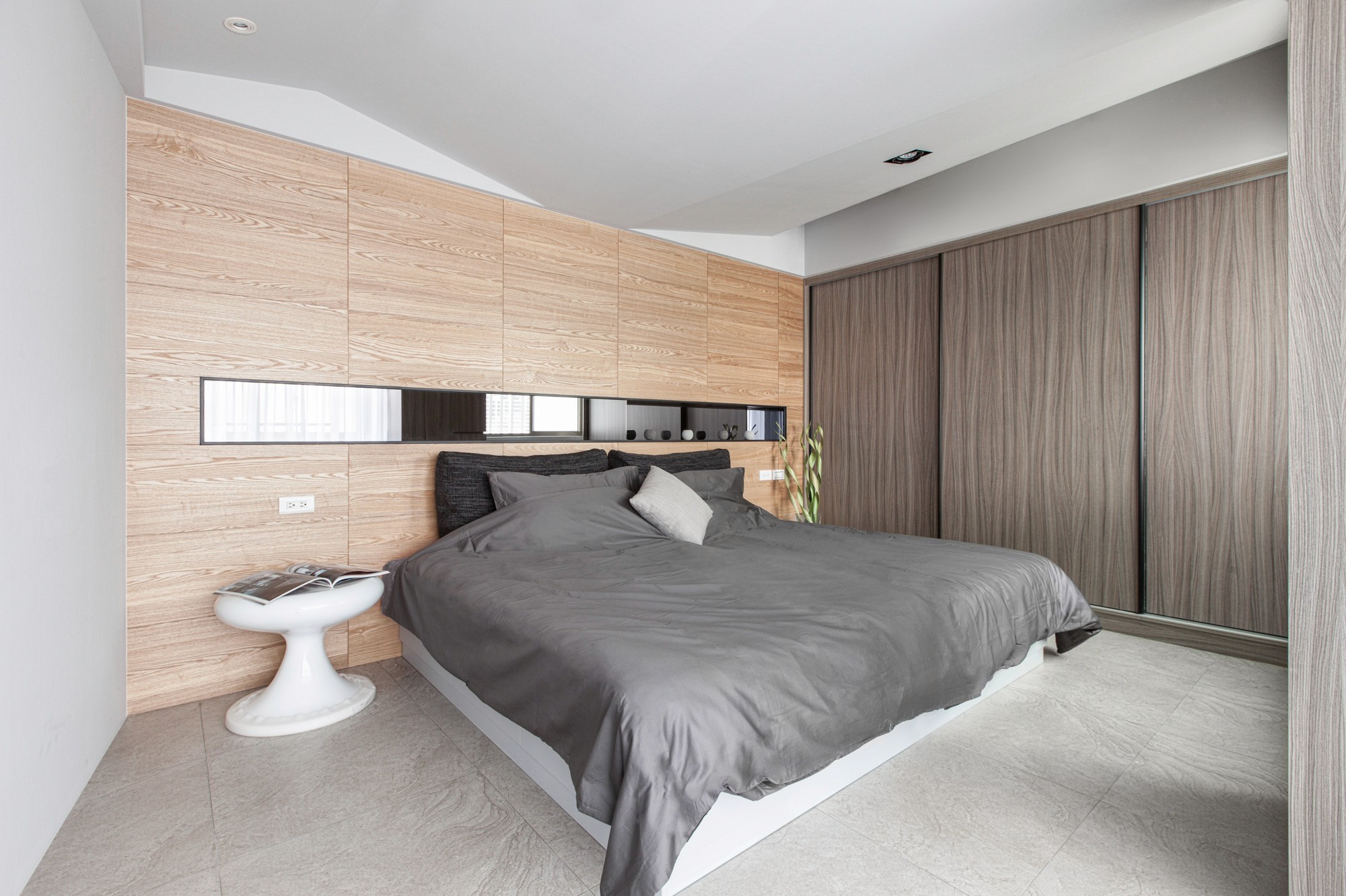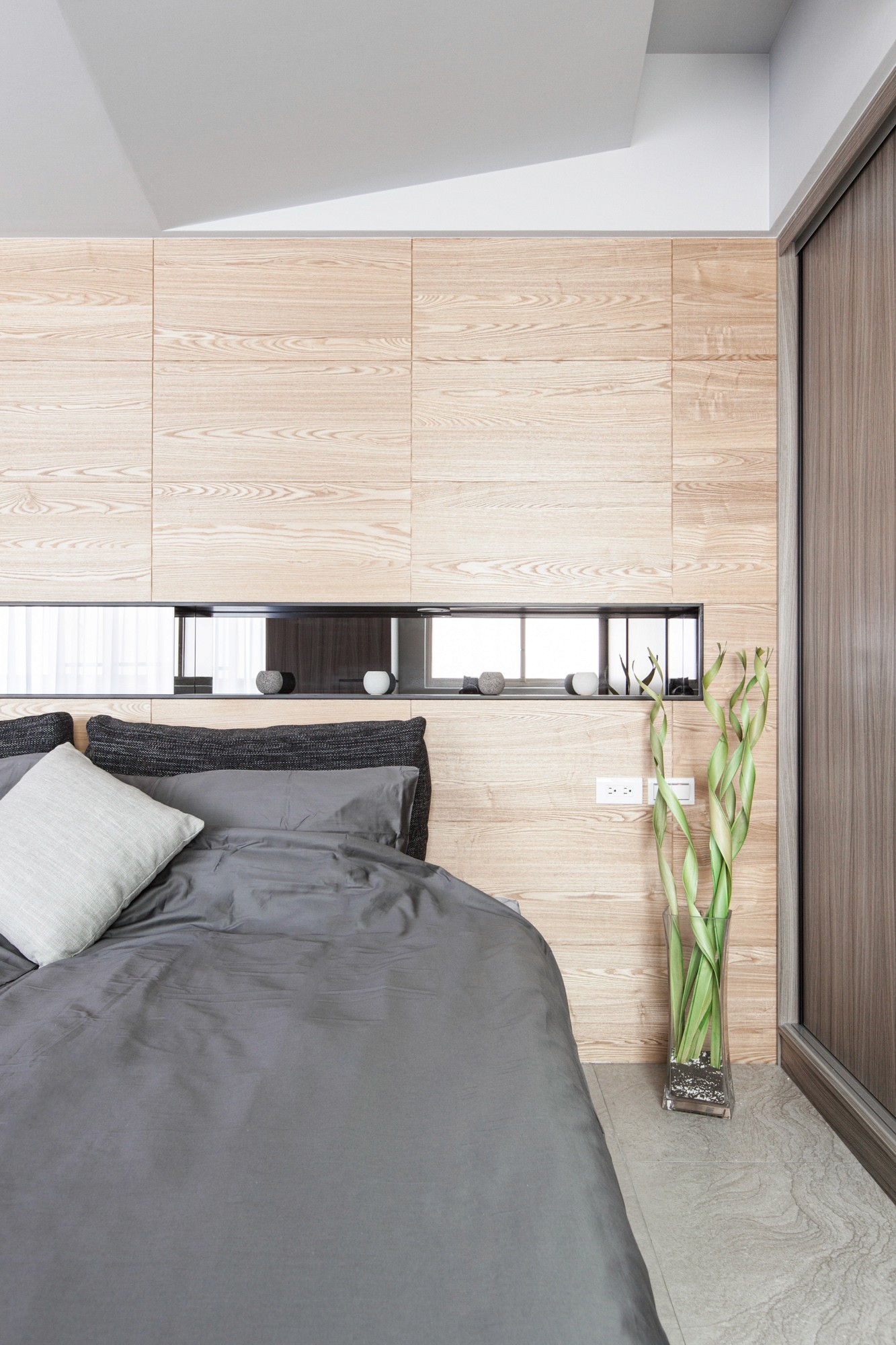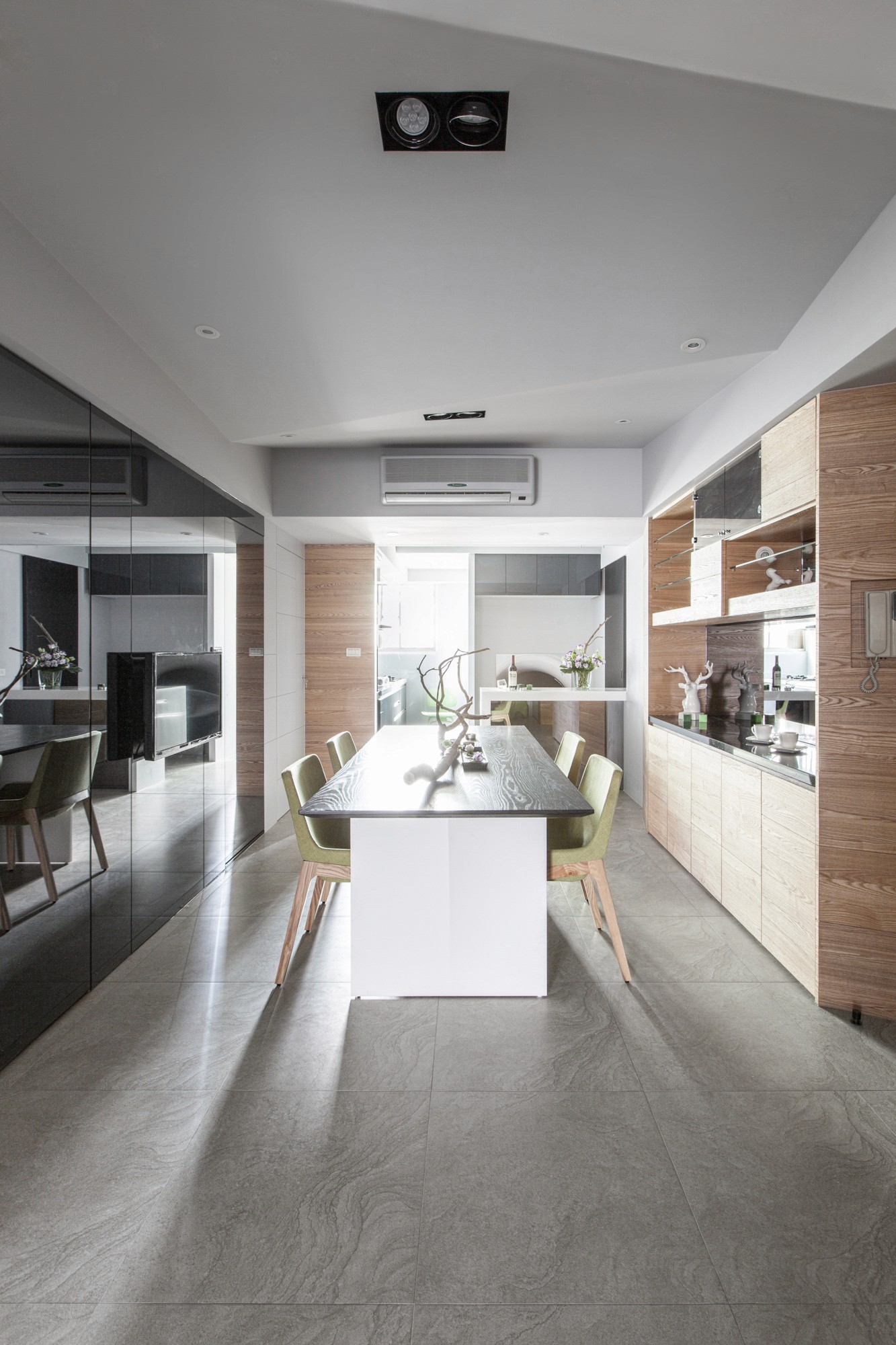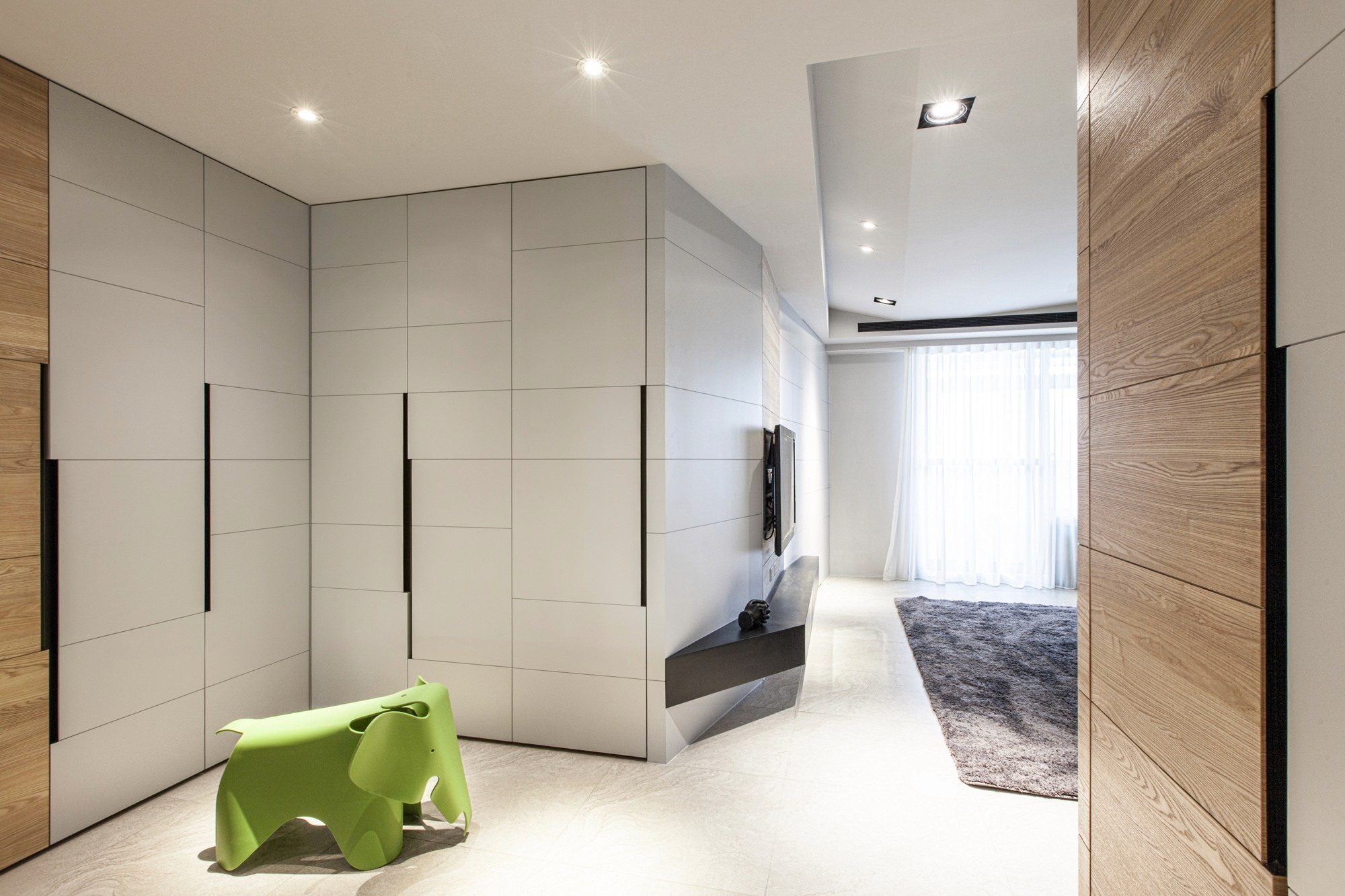 在了解屋主因為兒女各自開枝散葉必須整理房子,家庭擁有如同大樹葉脈般成長、延伸、壯大的傳承寓意,在空間上不全然使用垂直水平配置,改用如葉脈般的斜線界定;在天花與壁面造型上亦呼應相同斜線邏輯並適時的加入天然木紋紋理;在顏色運用上使用大量令人放鬆的淺灰色並在家具上點綴些許綠色,客廳落地窗邊放置落地植栽,營造退休放鬆的氛圍。