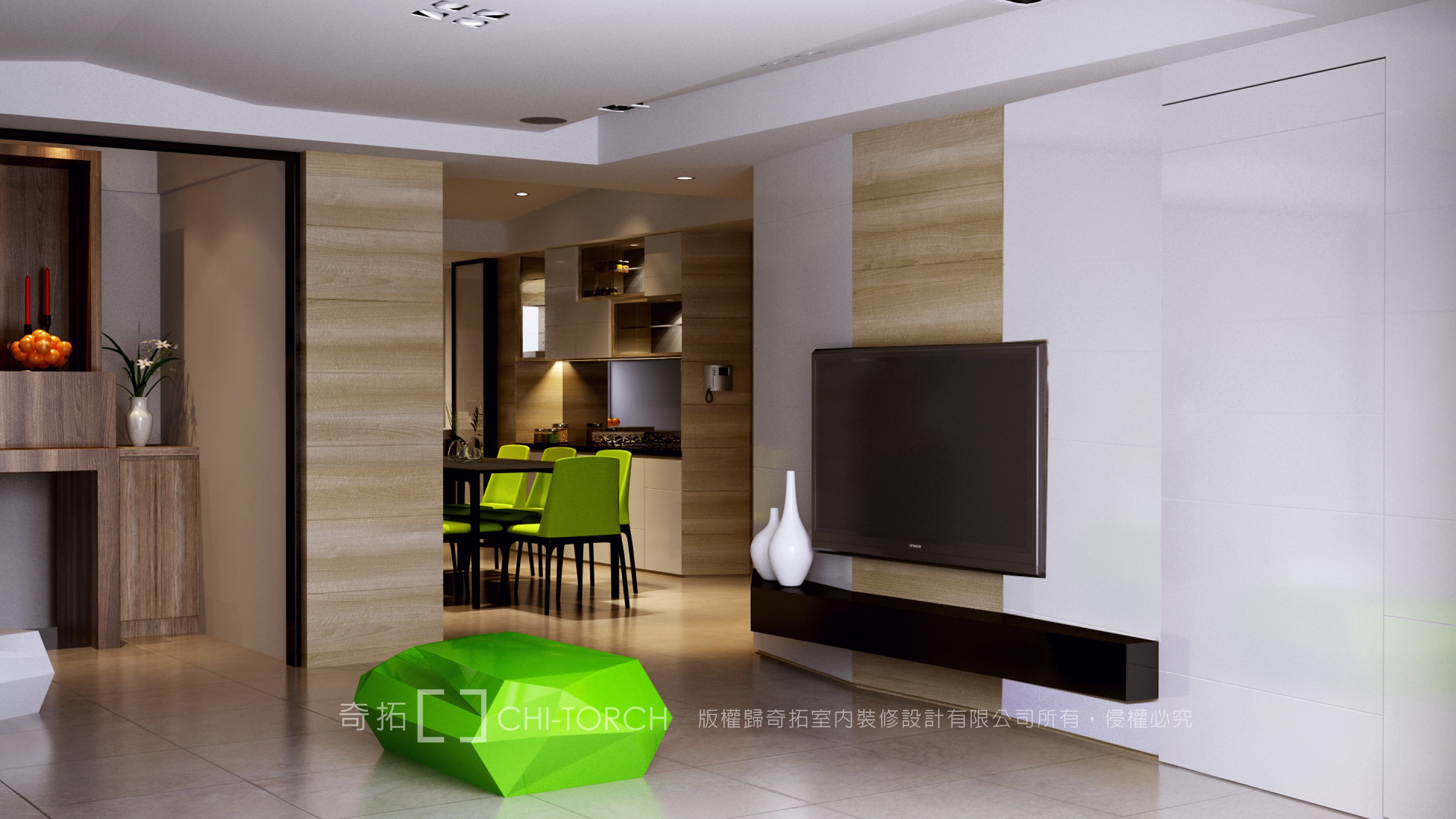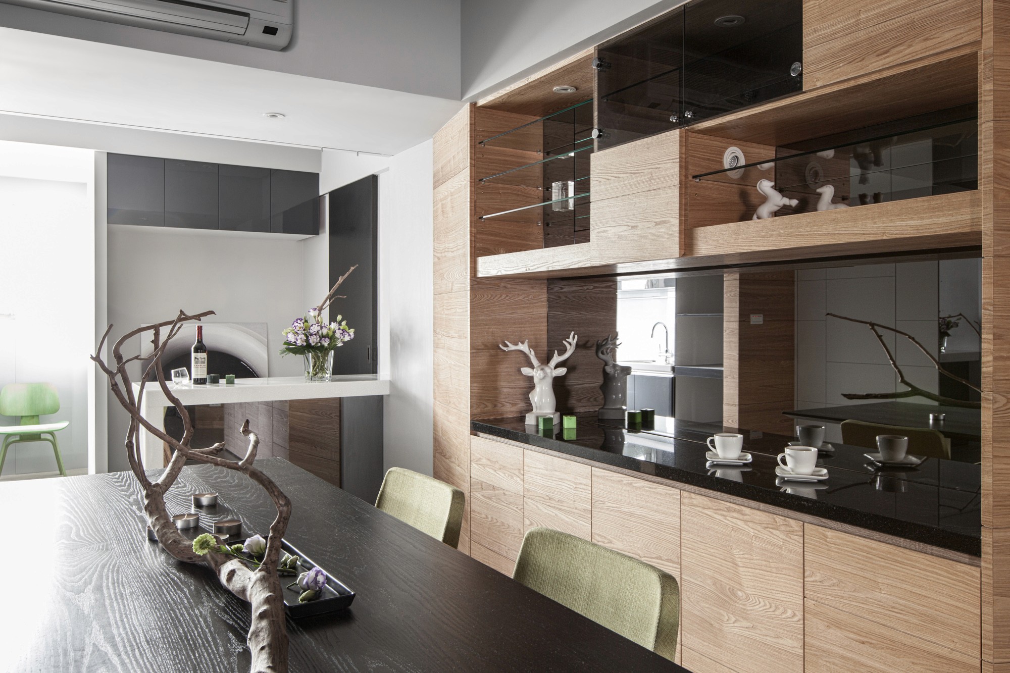 原本空間是5房2廳,因為家庭成員改變,未來僅須2房2廳,加上沒有玄關與神龕空間,為了增設這兩個空間與臥室、廚房的寬敞,刻意將原本客廳與主臥室對調,形成玄關並增加鞋櫃與收納,營造出空間深度,讓空間放大,讓人坐在客廳沙發上就可以直接看到誰進家門,如此一來更整合了2間小臥室尺度,形成一個寬敞、採光極佳的主臥室。傳統神龕佛堂配置上必須緊臨客廳,並且要有可以看出窗外的特色,也因客廳與主臥室空間配置對調,滿足了神龕佛堂傳統上的需求,更讓南面和煦的陽光可以經由客廳延伸至神龕,甚至到達玄關與餐廳,讓整個家的各個空間皆擁有自然採光,白天減少電燈使用,達到節能減碳的效果。