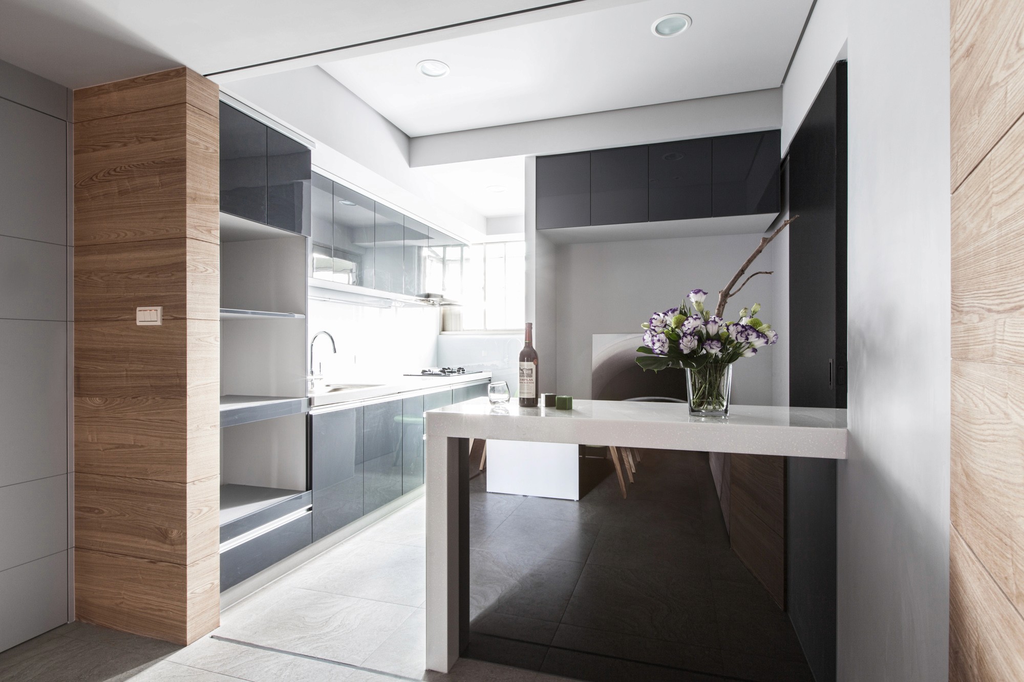 經過空間調整與氛圍營造,讓屋主兩夫妻的退休宅擁有如同沐浴大自然般愜意舒適且寬敞,經過空間整合與放大,解決原本過多小空間與採光問題,每當過年過節全家相聚時,女主人更是可以在放大的半開放廚房大展身手,不會獨立在廚房中,能夠彼此開心互動與照顧,滿足退休生活的所需。